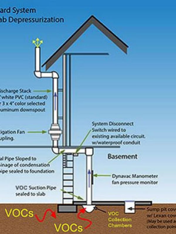 We install perforated piping beneath the vapor barrier, connected to a high-performance radon fan. The fan creates negative pressure under the barrier, pulling radon gas out and venting it safely above the home.